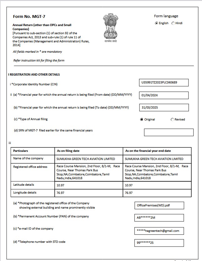 Form MGT-7 is an annual return form that every company must file with the Ministry of Corporate Affairs (MCA) under the Companies Act, 2013. It contains key details like shareholding pattern, directors, and company compliance information for the financial year.